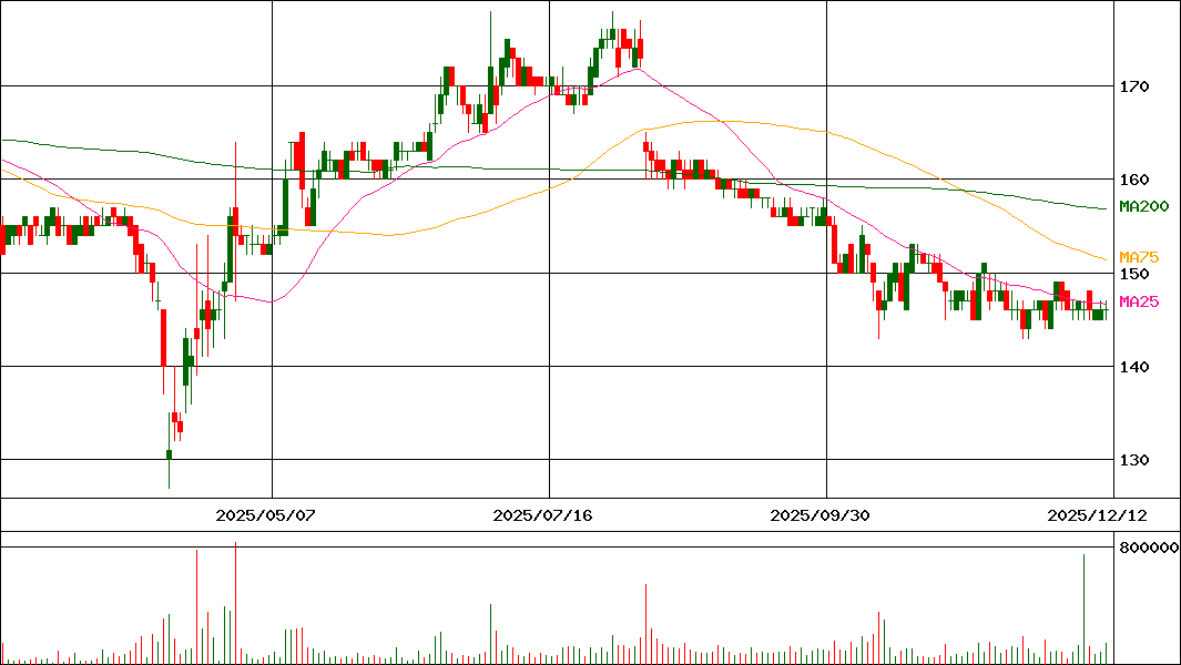 | 移動平均線 | 146.68(-2.73bp) | 151.413(-12.31bp) | 156.79(-3.19bp) |