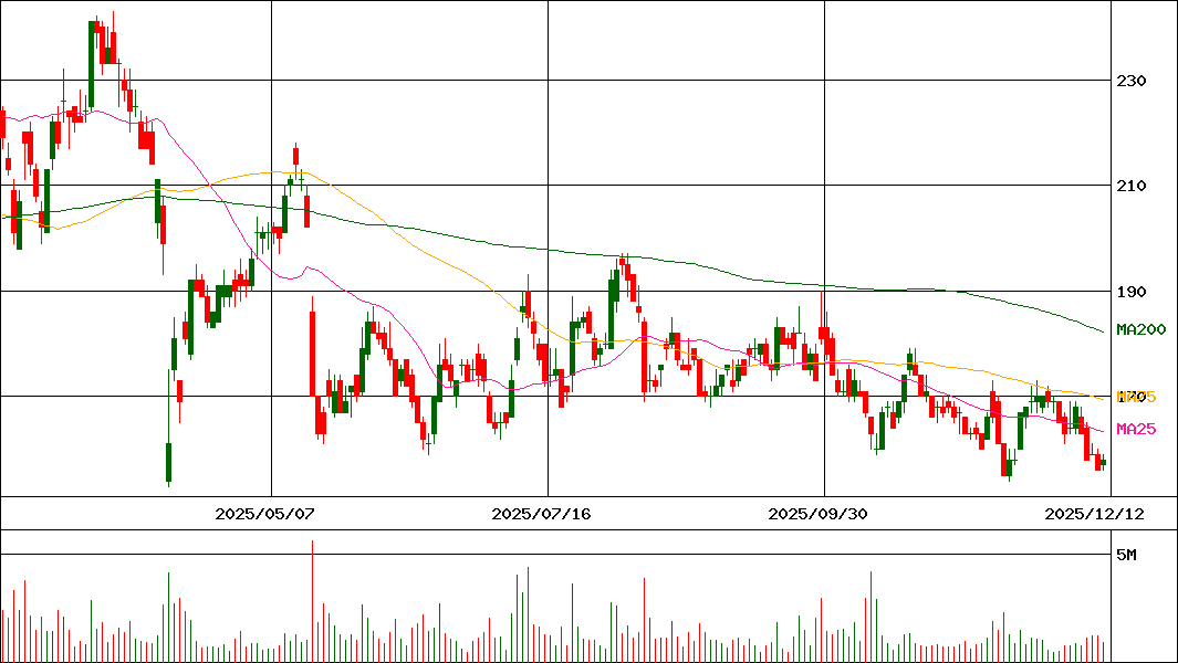 | 移動平均線 | 163.44(-12.22bp) | 169.507(-13.33bp) | 182.255(-18.89bp) |