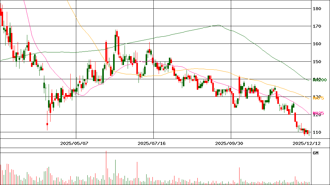 | 財務的に割高。 長期レンジを下方へブレイクしている。 株価は下降トレンドである。 |