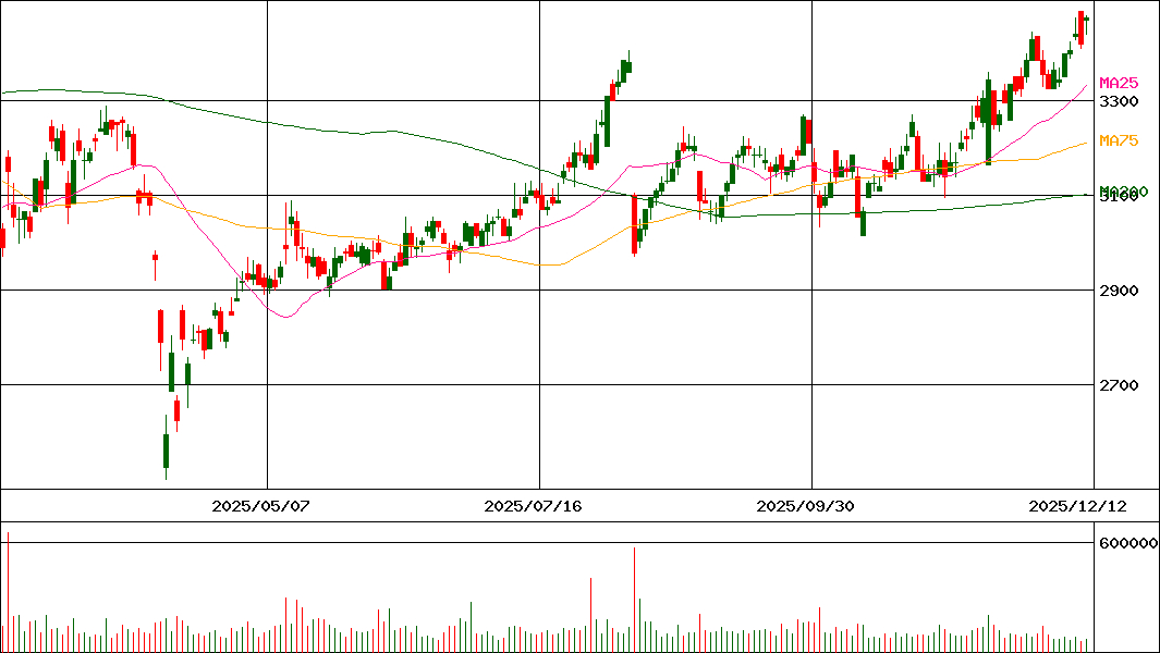 | 移動平均線 | 3331.8(+36.75bp) | 3211.93(+11.64bp) | 3103.8(+7.09bp) |