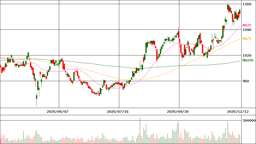 | 移動平均線 | 1100(+40.16bp) | 1063.4(+11.30bp) | 1004.55(+7.27bp) |